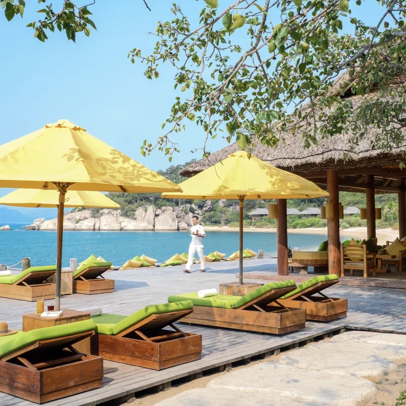 As close to the water as you can get, set right at water's edge and overlooking Ninh Van Bay’s coral formations.